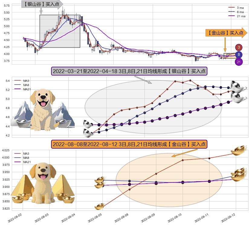 ⚀ 2022-08-09-日至2022-08-12-日显现 3日-8日-21日均线 【金山谷】买入点 其再次确认了买入信号,可靠性更强,买入