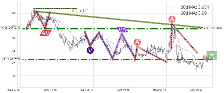 ♘ 阻力价格位5.38,可信任强度96.14%,距离最后交易2022-08-12形成的收盘价格4.03相差 +33.44%