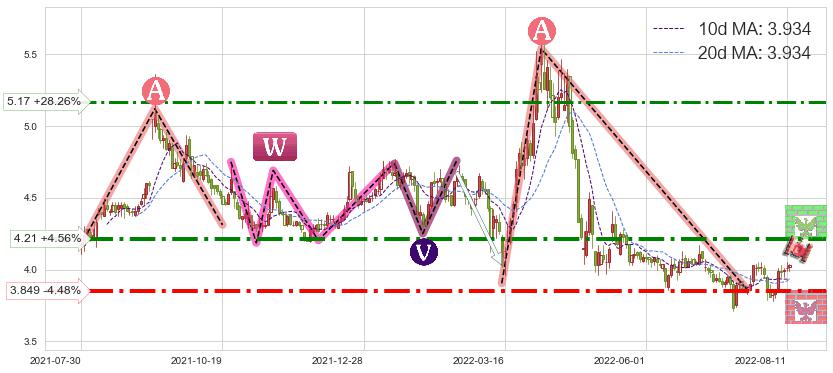 ♘ 阻力价格位4.21,可信任强度74.31%,距离最后交易2022-08-12形成的收盘价格4.03相差 +4.56%