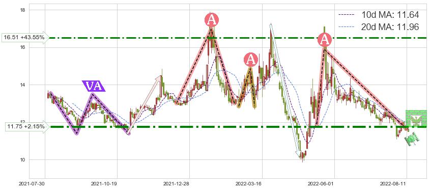 ♘ 阻力价格位11.75,可信任强度74.08%,距离最后交易2022-08-12形成的收盘价格11.50相差 +2.15%