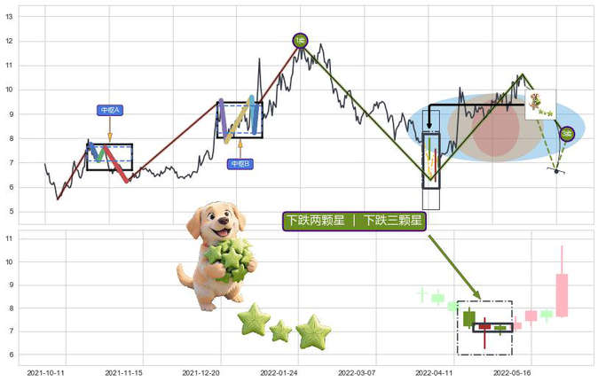 ➢ 🐸 下跌两颗星 | 下跌三颗星形态方向: 消极反向形态,对未来预期 看空