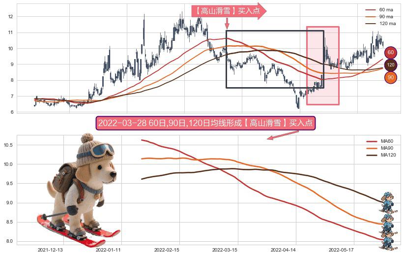 形态多维评估: ⚀ 2022-01-20日-2022-05-31日显现 60日-90日-120日均线 【高山滑雪】买入点 看多信号,后市看涨,买入
