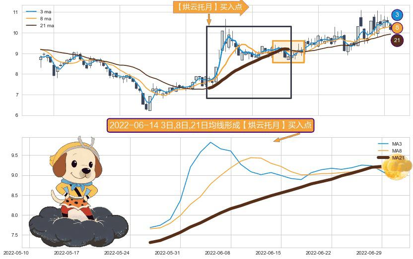 形态多维评估: ⚀ 2022-05-26日-2022-06-30日显现 3日-8日-21日均线 【烘云托月】买入点 看多信号,后市看涨,买入
