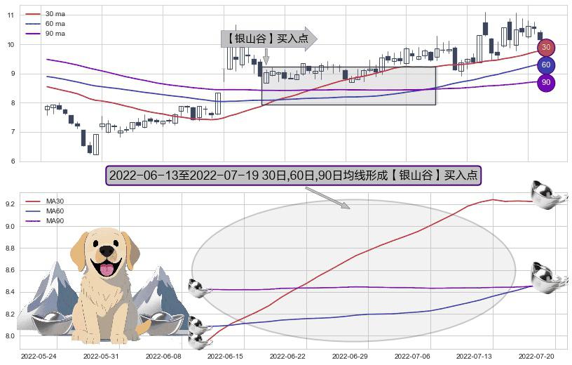 形态多维评估: ⚀ 2022-06-14-日至2022-07-19-日显现 30日-60日-90日均线 【银山谷】买入点 看多信号,后市看涨,买入