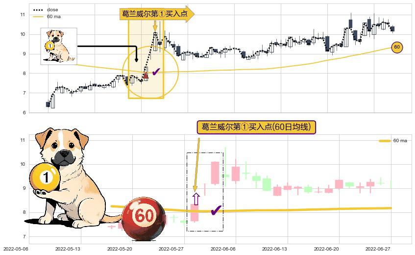 形态多维评估: ⚀ 2022-05-30-日显现 葛兰威尔均线 60日均线 第买①入点 走势反转见底信号,后市看涨,买进信号