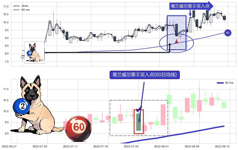 形态多维评估: ⚀ 2022-07-25-日显现 葛兰威尔均线 60日均线 第②买入点 上升趋势的中继信号,后市看涨,买进信号