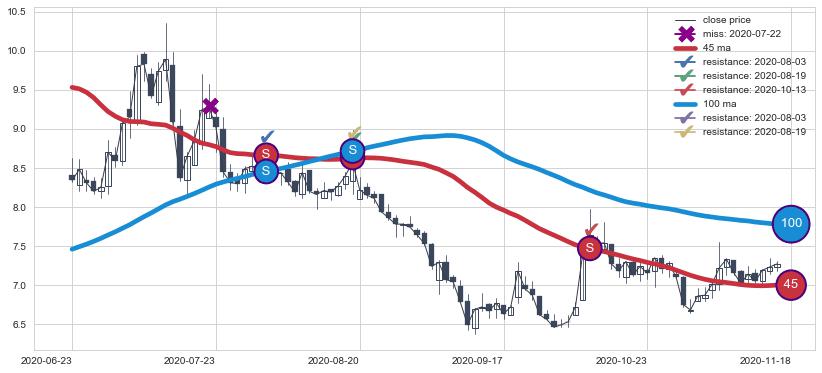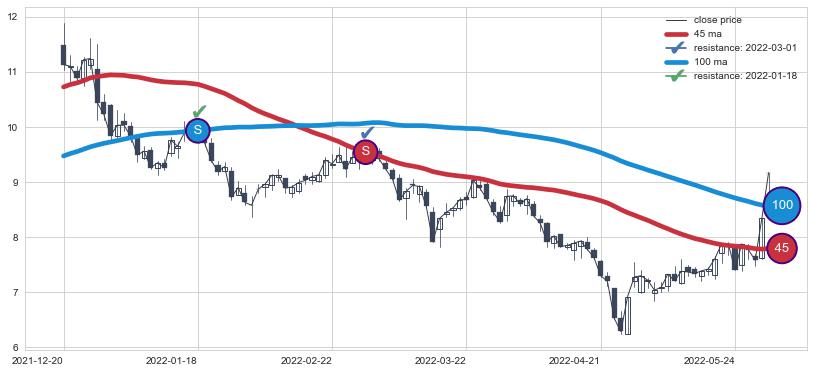 下跌趋势2021-12-20-2022-05-31,均线100, 45确认关键阻力2处