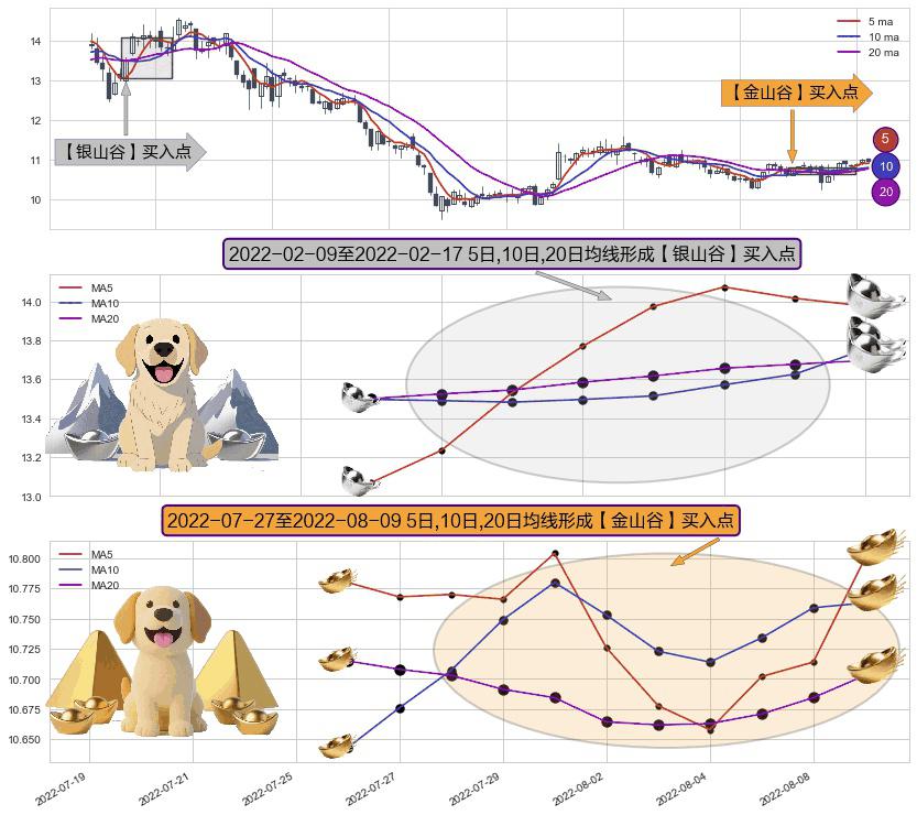 ⚃ 2022-07-28-日至2022-08-09-日显现 5日-10日-20日均线 【金山谷】买入点 其再次确认了买入信号,可靠性更强,买入