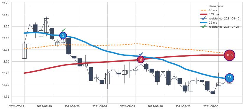 ⚁ MA3和MA8走势平行,且始终保持在短距离内,MA21始终在短中期均线上方,与短中期均线保持一定的距离,微微下行