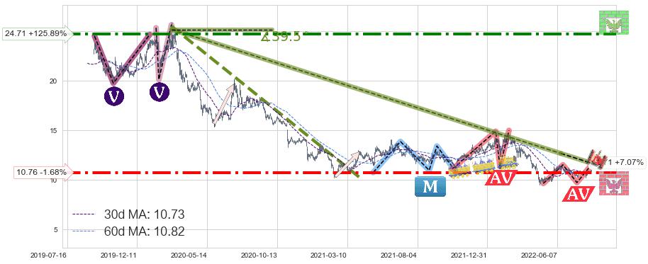 🦴 长线均值回复组合短线趋势跟踪[强阻力信号]2020-02-27-2022-06-14下跌趋势依然成立(下跌趋势跟踪依然存在),短线价格略微上行反弹(均值回复猜想),即将接近下跌趋势提供的未破位阻力价格:11.71。