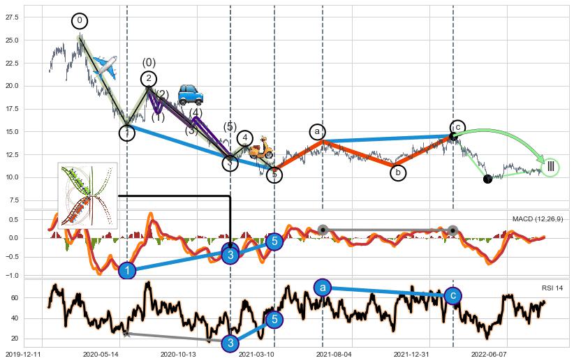 ➣ 第一, 三, 五浪下跌动能逐渐【衰弱变小】,趋势呈现不稳迹象