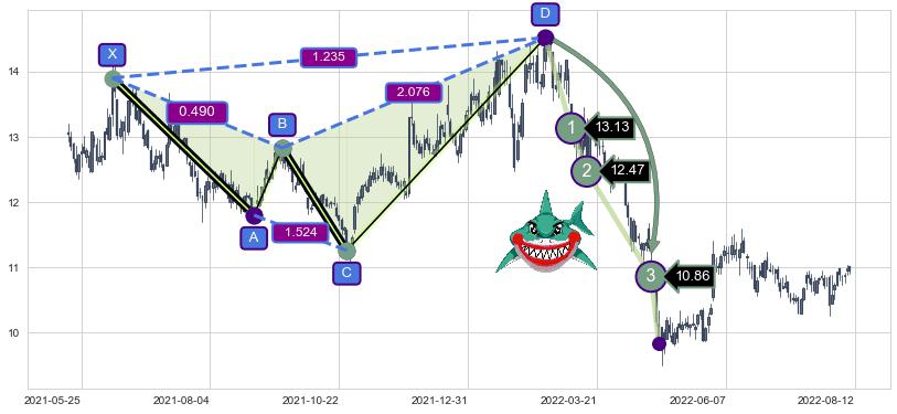 ➣ 已完成【鲨鱼】形态起点X: 2021-06-10, 终点D: 2022-02-21, 共169交易日