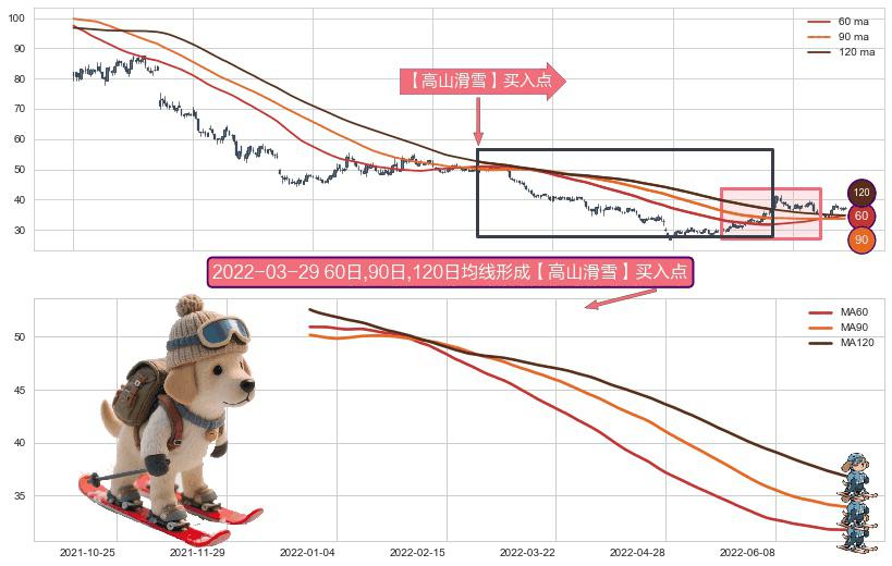 形态多维评估: ⚀ 2021-12-24日-2022-06-30日显现 60日-90日-120日均线 【高山滑雪】买入点 看多信号,后市看涨,买入