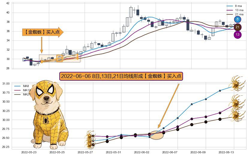 形态多维评估: ⚀ 2022-06-06日显现 8日-13日-21日均线 【金蜘蛛】买入点 看多信号,后市看涨,买入