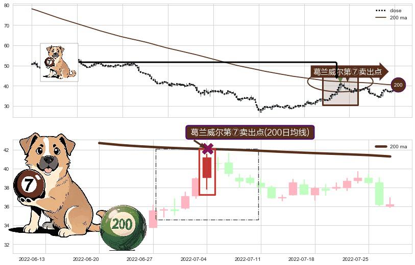 形态多维评估: ⚀ 2022-07-04-日显现 葛兰威尔均线 200日均线 第⑦卖出点 下降趋势的中继信号,后市看跌,卖出信号