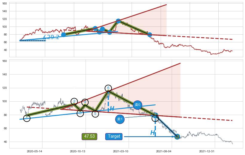➣ 【支撑】低点支撑位【③⑤⑦】一底低于一底,构成扩散三角的下斜边
