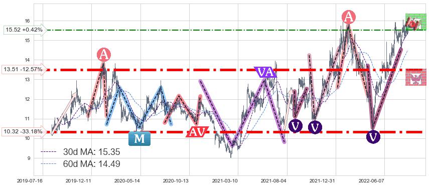 ♘ 阻力价格位15.52,可信任强度54.17%,距离最后交易2022-08-12形成的收盘价格15.45相差 +0.42%