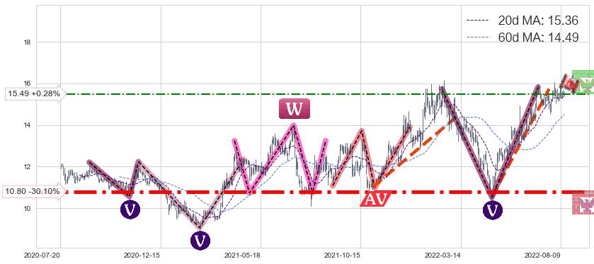 ♘ 阻力价格位15.49,可信任强度54.85%,距离最后交易2022-08-12形成的收盘价格15.45相差 +0.28%