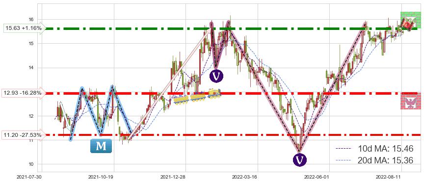 ♘ 阻力价格位15.63,可信任强度94.07%,距离最后交易2022-08-12形成的收盘价格15.45相差 +1.16%