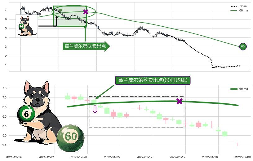 形态多维评估: ⚀ 2021-12-29-日显现 葛兰威尔均线 60日均线 第⑥卖出点 走势反转见顶信号,后市看跌,卖出信号