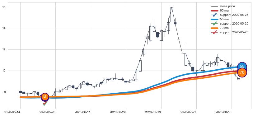 上涨趋势2020-05-14-2020-08-12,均线65, 70, 55确认关键支撑1处