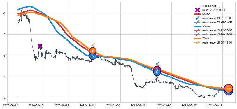 下跌趋势2020-08-12-2021-06-16,均线65, 70, 55确认关键阻力2处