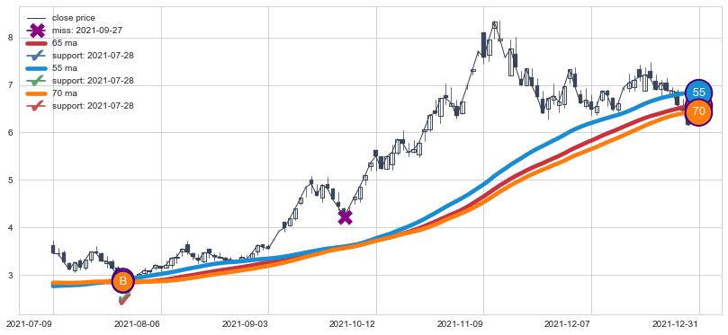 上涨趋势2021-07-09-2021-12-31,均线65, 70, 55确认关键支撑1处