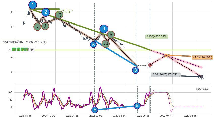 ♘ 在最后的下跌阶段2021-11-11至2022-05-23,存在 持续未破位的阻力位 ,阻力价格2.906,可信任强度77.99%,其距离最后价格0.8900相差 +226.54%