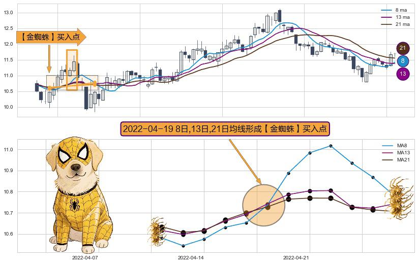 形态多维评估: ⚀ 2022-04-19日显现 8日-13日-21日均线 【金蜘蛛】买入点 看多信号,后市看涨,买入