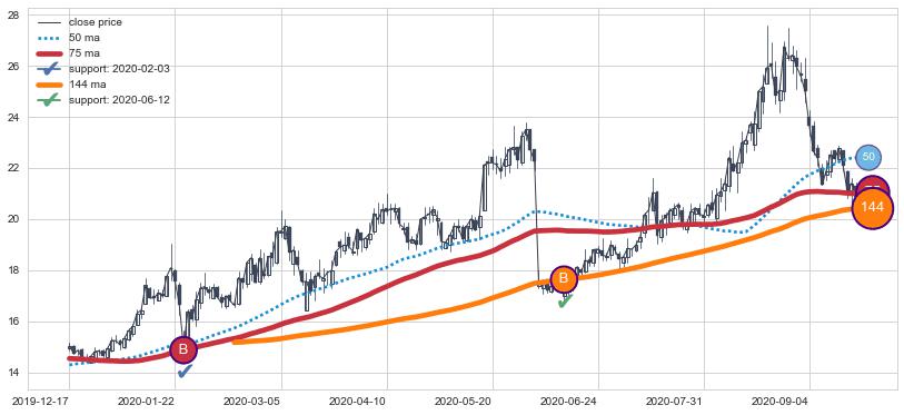 上涨趋势2019-12-17-2020-09-21,均线144, 75确认关键支撑2处