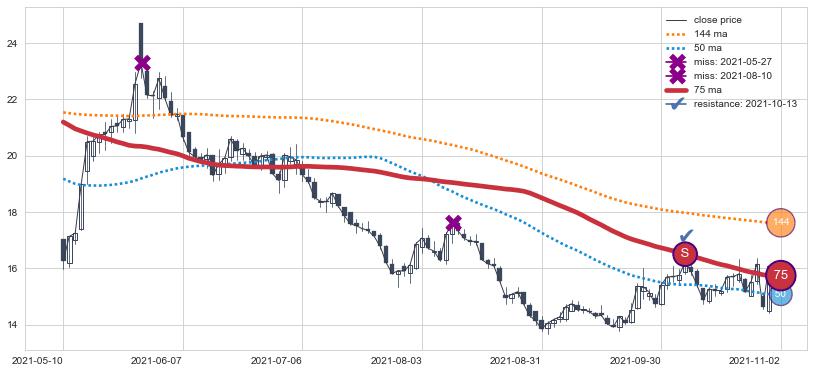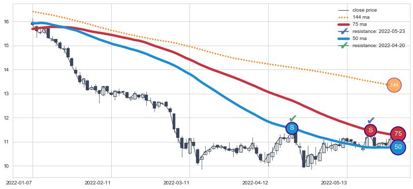 下跌趋势2022-01-07-2022-05-30,均线50, 75确认关键阻力2处