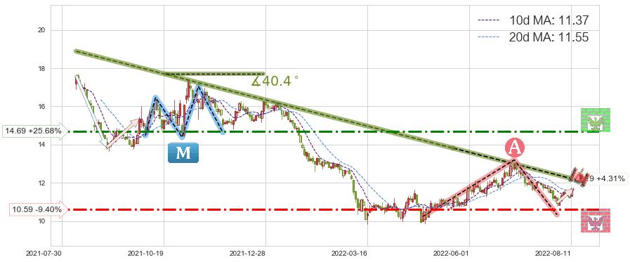 ♘ 阻力价格位14.69,可信任强度64.07%,距离最后交易2022-08-12形成的收盘价格11.69相差 +25.68%