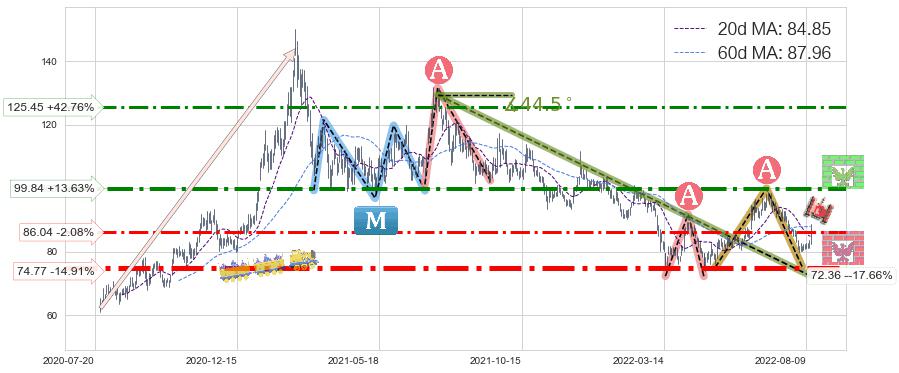 ♘ 支撑价格位86.04,可信任强度61.01%,距离最后交易2022-08-12形成的收盘价格87.87相差 -2.08%