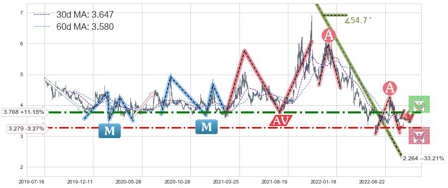 ♘ 阻力价格位3.768,可信任强度81.35%,距离最后交易2022-08-12形成的收盘价格3.390相差 +11.15%