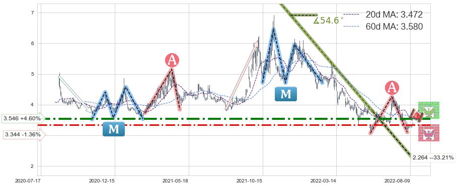 ♘ 阻力价格位3.546,可信任强度75.92%,距离最后交易2022-08-12形成的收盘价格3.390相差 +4.60%