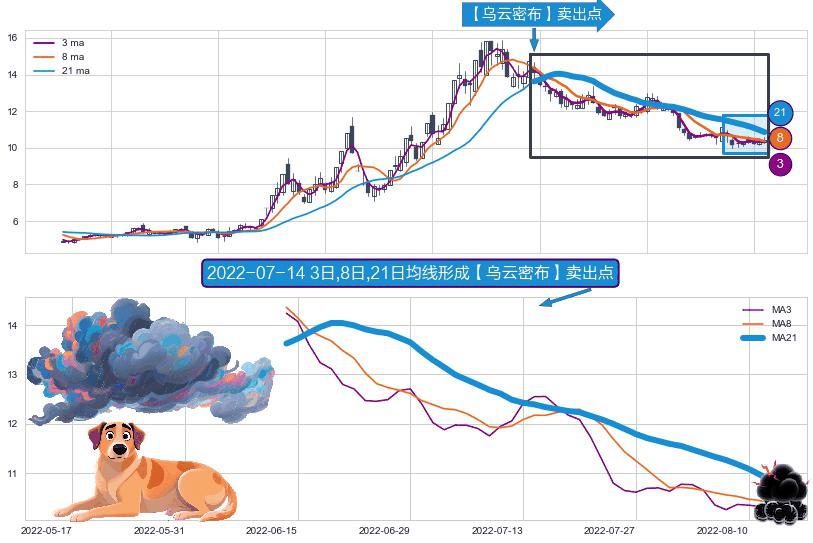 ⚀ 2022-06-14日-2022-08-12日显现 3日-8日-21日均线 【乌云密布】卖出点 看空信号,后市看跌,卖出
