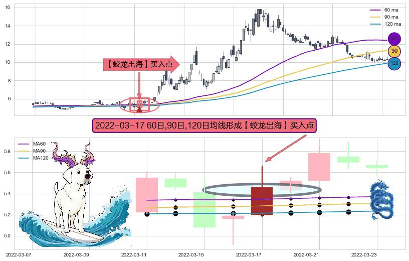 ⚀ 2022-03-17日显现 60日-90日-120日均线 【蛟龙出海】买入点 看多信号,后市看涨,买入