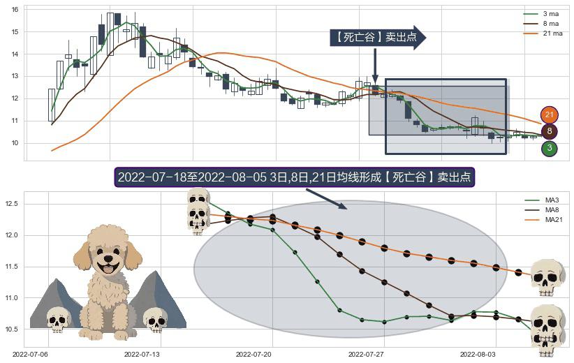 ⚀ 2022-07-19-日至2022-08-05-日显现 3日-8日-21日均线 【死亡谷】卖出点 看空信号,后市看跌,卖出