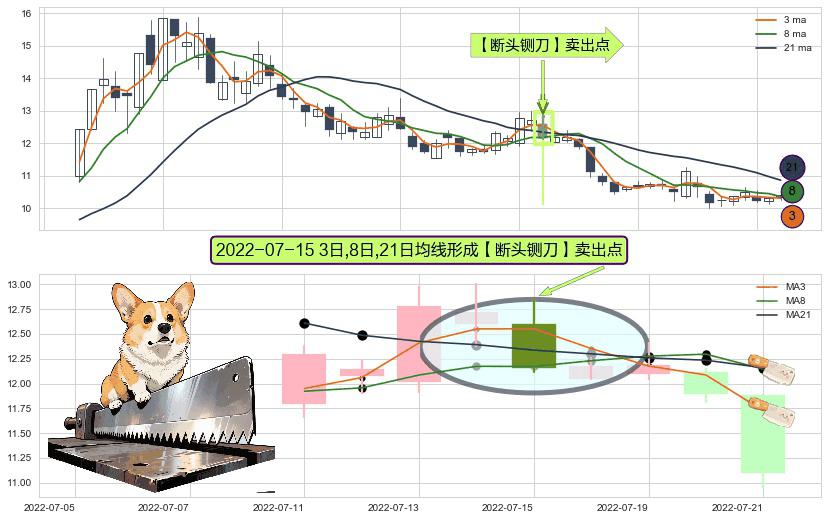 ⚀ 2022-07-15日显现 3日-8日-21日均线 【断头铡刀】卖出点 看空信号,后市看跌,卖出