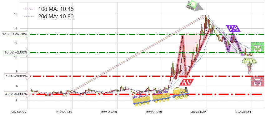 ♘ 阻力价格位10.62,可信任强度56.88%,距离最后交易2022-08-12形成的收盘价格10.41相差 +2.00%
