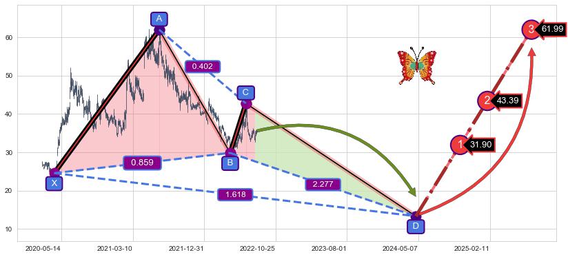 ➣ 未完成【蝴蝶】形态起点X: 2020-04-13, 已到达C点: 2022-06-30, 预测最终D点: 2024-04-26, 共1008交易日