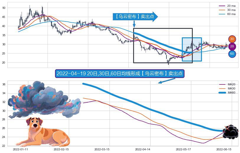 ⚀ 2022-02-24日-2022-06-13日显现 20日-30日-60日均线 【乌云密布】卖出点 看空信号,后市看跌,卖出