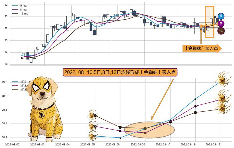⚀ 2022-08-10日显现 5日-8日-13日均线 【金蜘蛛】买入点 看多信号,后市看涨,买入
