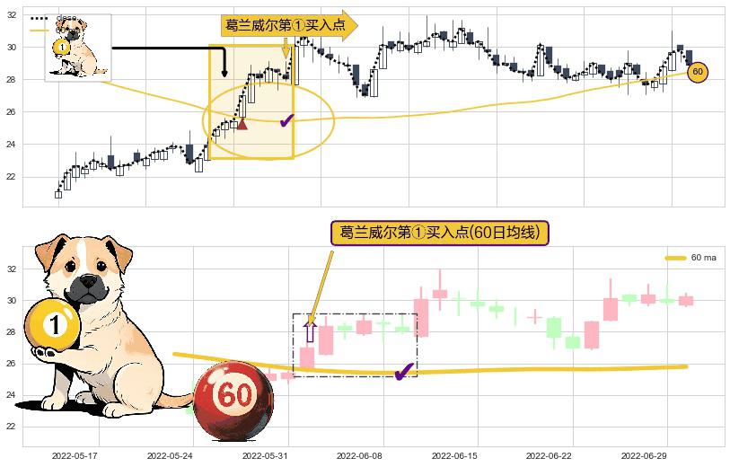 ⚀ 2022-06-01-日显现 葛兰威尔均线 60日均线 第买①入点 走势反转见底信号,后市看涨,买进信号