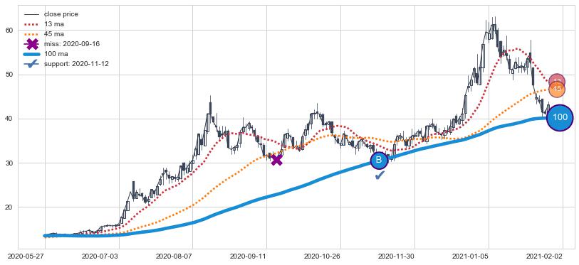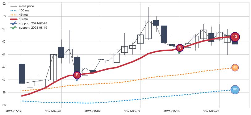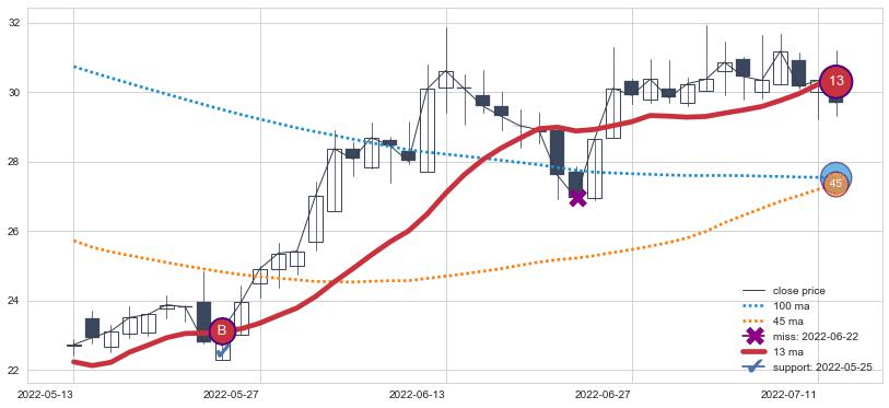 ⚀ 中期均线MA8上穿长期均线MA13形成的交叉是标准 黄金交叉