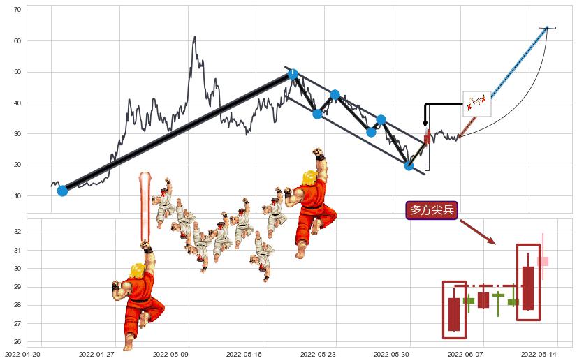 | 12 🅚:徐缓上升 ➕ 📐:降旗形向上突破击穿阻力位, 猜想持续拉升上涨,被突破的阻力位已变为支撑位 ☞ 看多信号 ⇥ 【🅚线】交织【图形】⇥ 综合量化分数: 60 | > |