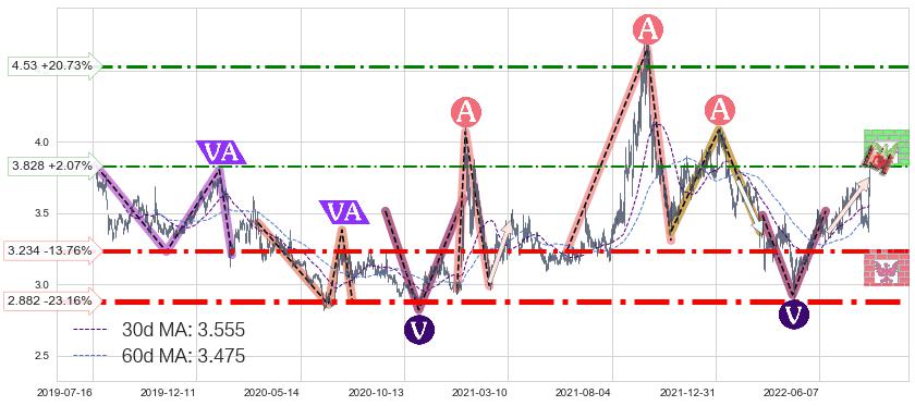 ♘ 阻力价格位3.828,可信任强度54.67%,距离最后交易2022-08-12形成的收盘价格3.750相差 +2.07%