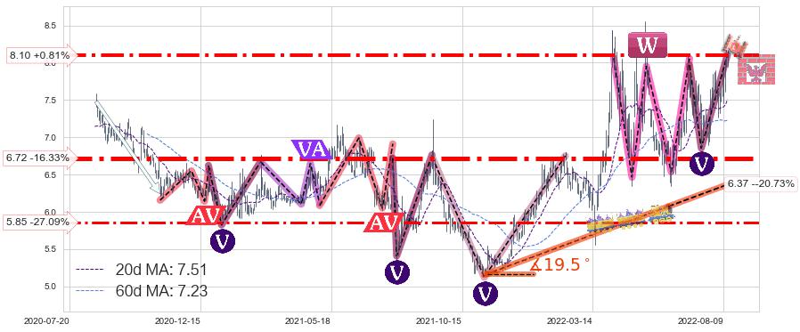 ♘ 支撑价格位6.72,可信任强度99.00%,距离最后交易2022-08-12形成的收盘价格8.03相差 -16.33%