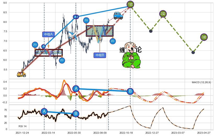 ➢ 【AI智能预测】缠论终点位置: (2022-10-11: 8.83 ), 预测段共42交易日, 缠论共213交易日