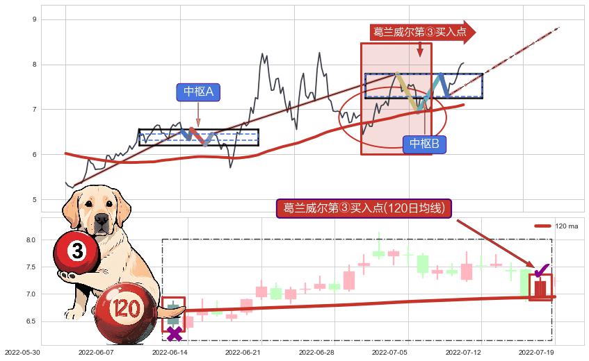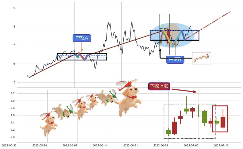 ➢ 【中枢B】:2022-07-04-2022-08-03,中枢由4笔构成,共23交易日, ZG=7.77, ZD=7.29